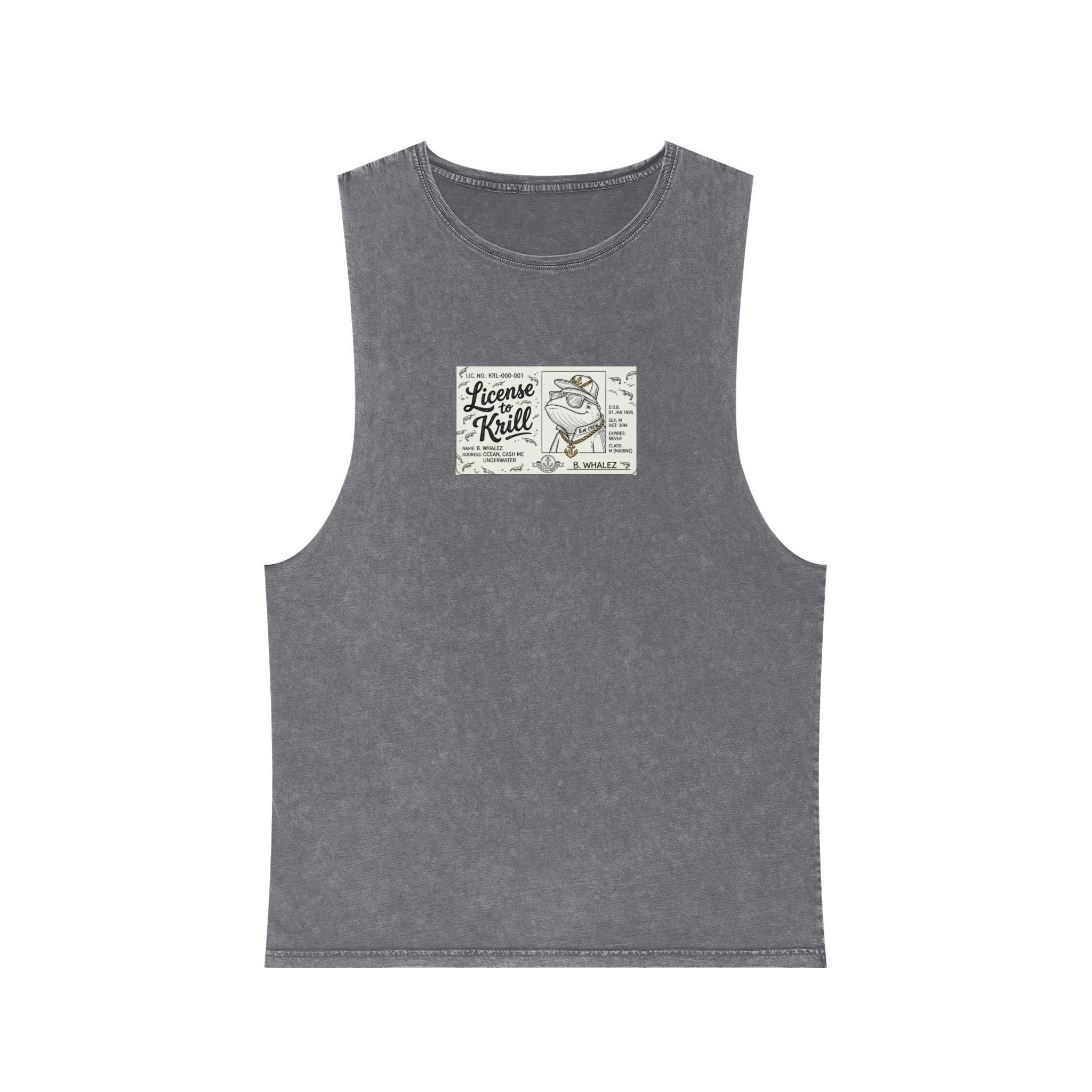 This stonewash tank brings a salty, slightly rebellious energy to warm days and layered looks. The lightweight, pre-shrunk combed cotton feels soft against sun-warmed skin while the cut-off raw sleeves and washed-gray finish give it a lived-in, coastal vibe. A playful, line-drawn blue whale badge and the cheeky “license to krill” slogan sit over the chest — subtle, tongue-in-cheek attitude that works at the pier, on a surf trip, or under an open shirt at a backyard cookout. It sits with a relaxed, regular fit and a ribbed collar that stretches comfortably over the head then snaps back, with reinforced shoulder tape and double-stitched hem for durability through summers of wear.