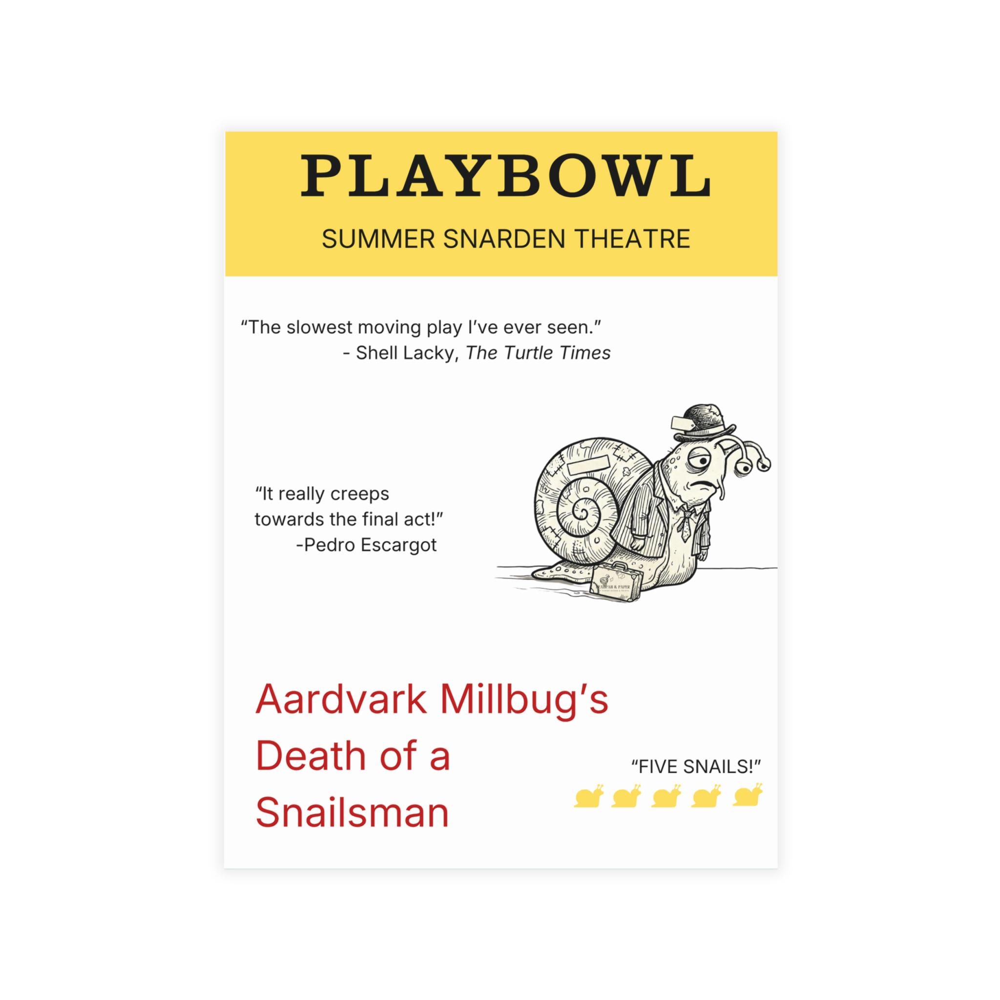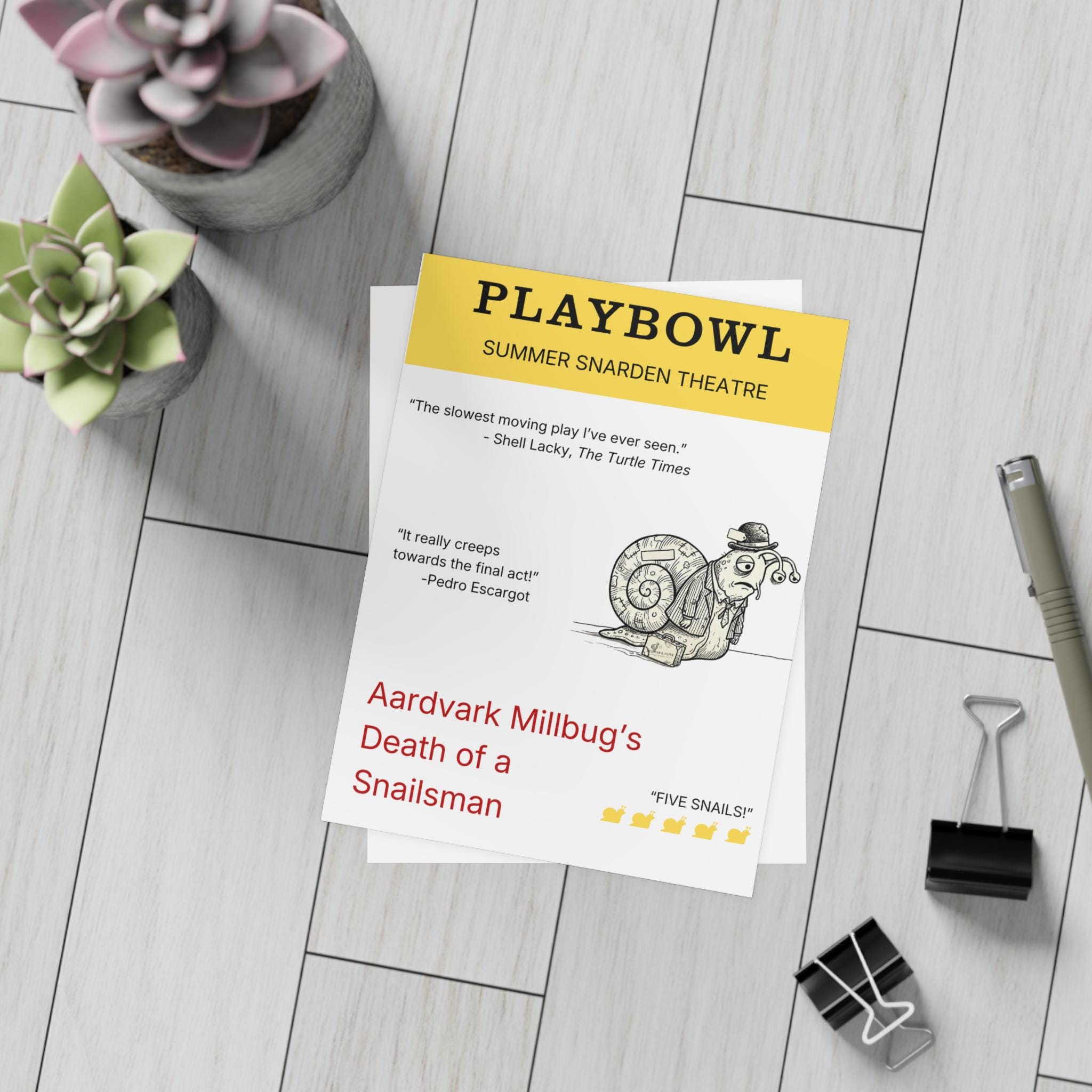 This Playbill-inspired postcard brings theatrical drama to a much more realistic pace: painfully slow. Featuring the fictional Summer Snarden Theatre, glowing (and suspiciously specific) reviews, and one very tired snail lead, this design is a perfect mix of literary parody and deadpan humor.